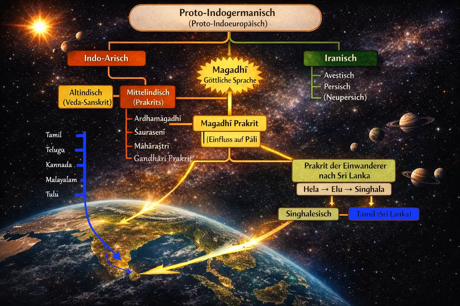So bleibt Māgadhī – die Ursprungssprache – nicht nur ein Laut vergangener Tage. Sie war eine Struktur des Geistes selbst, eine Form der Wahrheit. In ihr wurde das Dhamma geboren, geformt durch die Stimme des Erwachten. Wer heute lauscht, lauscht nicht nur Worten – er hört das Echo des Erwachens.