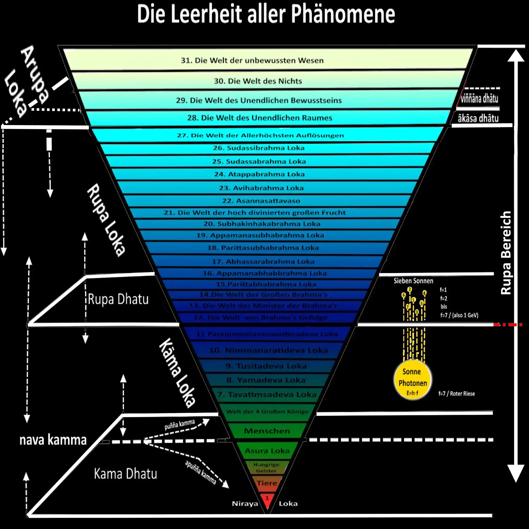 “[…] Lebewesen, die sich in einer dieser drei Rupa Ebenen befinden, unterliegen dem Kreislauf von Geburt und Tod (Saṃsāra). Ihr Dasein ist zeitlich begrenzt, und das individuelle Bewusstsein wandert entsprechend dem Wirken von Kamma durch die verschiedenen Existenzebenen. Der Buddha berichtete, in der Nacht seiner Erleuchtung Erinnerungen an unzählige frühere Existenzen gehabt zu haben, ohne einen Anfang des Kreislaufs finden zu können. Die Gesamtheit dieser Erinnerungen und die karmischen Prägungen sind im sogenannten Nāma Loka, der mentalen Welt, gespeichert. Hier befinden sich auch die kammischen Energien, die als Kamma Bīja (Karmasamen) und die fünf Daseinsgruppen (Pañcakkhandha) bezeichnet werden.