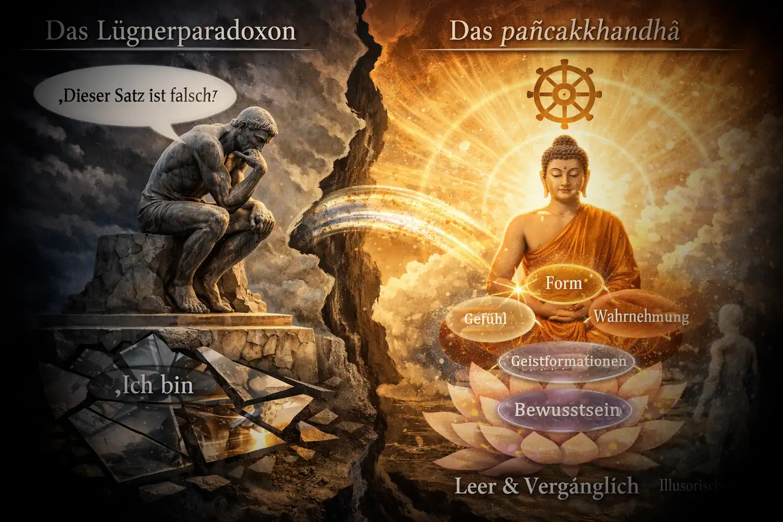 Aufgrund dieser Struktur kann das Lügenparadoxon, das auf der Annahme eines festen, unabhängigen Subjekts beruht, in der buddhistischen Analyse nicht entstehen. Selbstreferenzielle Widersprüche wie „Dieser Satz ist falsch“ setzen ein festes Zentrum voraus, das die Aussage bewertet oder widerspricht. Die Analyse der Aggregate zeigt jedoch, dass ein solches Zentrum illusorisch ist: Das „Selbst“ existiert nur relational und bedingt.