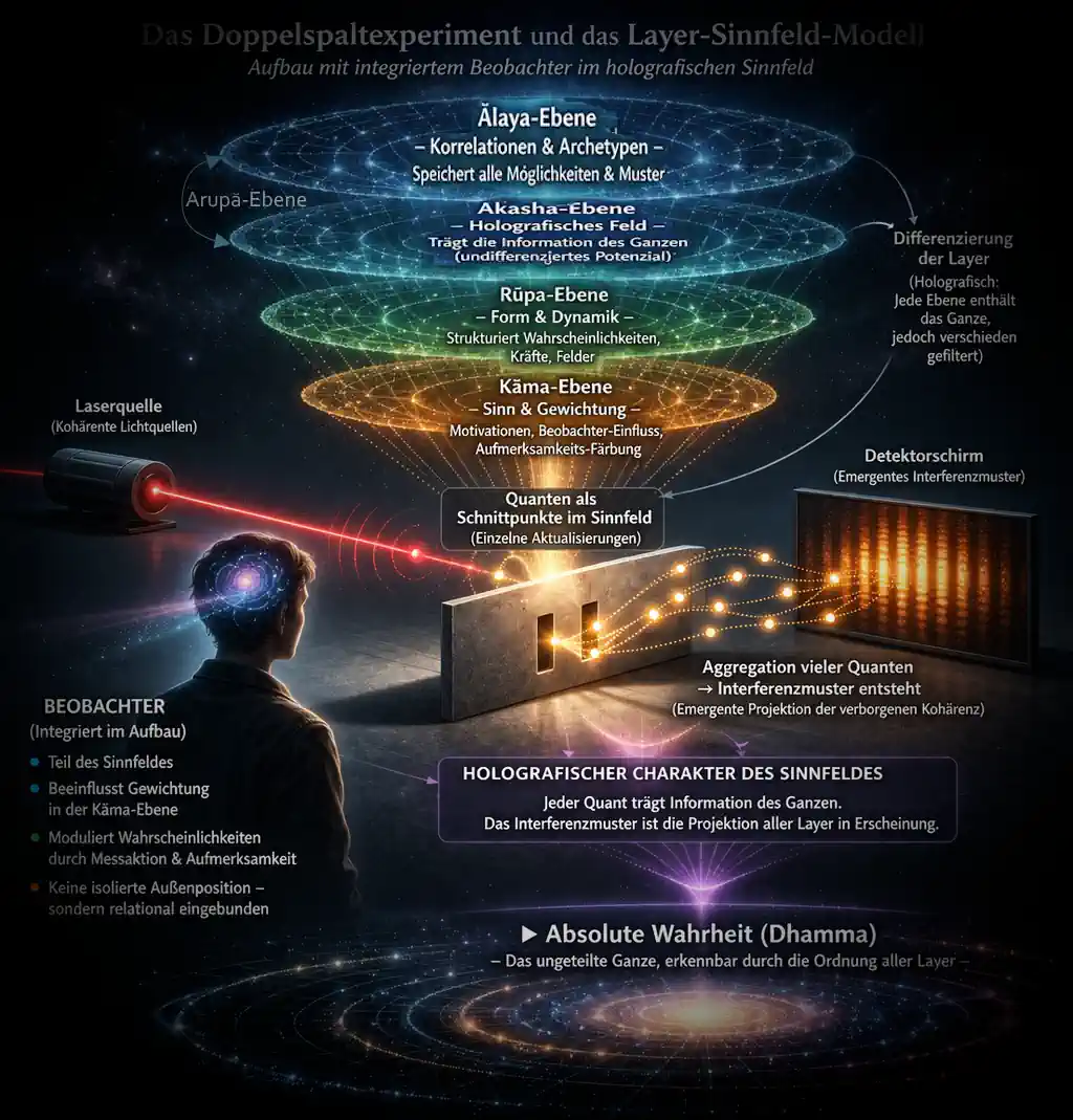 Jeder einzelne Quant trägt nur einen Ausschnitt der Informationen aus den Layern. Erst die Aggregation vieler Quanten offenbart das Interferenzmuster, das die zugrunde liegende Kohärenz der Schichten reflektiert. Dieser Prozess kann als aktiver Erkenntnisvorgang verstanden werden: Jede Aktualisierung ist nicht neutral, sondern hypothetisch „gefühlsmäßig gefärbt“, resultierend aus der Wechselwirkung von Objekt, Beobachter und den Sinnfeld-Eigenschaften der Layer (Loka=Layer). Jede Manifestation trägt somit nicht nur statistische Information, sondern auch eine implizite Bedeutung, die aus der strukturellen Kohärenz des Systems hervorgeht.