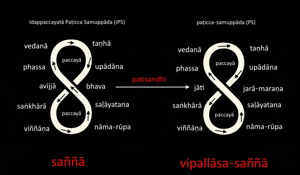 Die Wurzel dieses gesamten Prozesses liegt in sañjānāti, der verzerrten Wahrnehmung. Bereits die erste Sutta des Majjhima Nikāya weist darauf hin, dass ein puthujjana (gewöhnlicher Mensch) allen Dingen in der Welt mit einer solchen verzerrten saññā begegnet. Eigenschaften wie die Süße von Zucker, Farbe eines Objektes oder die Attraktivität einer Person sind keine inhärenten Merkmale der Objekte selbst, sondern entstehen als „vom Geist geschaffene verzerrte Wahrnehmungen“. Diese entstehen automatisch auf Grundlage des natürlichen Bhavaṅga-Zustands, mit dem ein Wesen in einem Bestimmten Loka geboren wird.