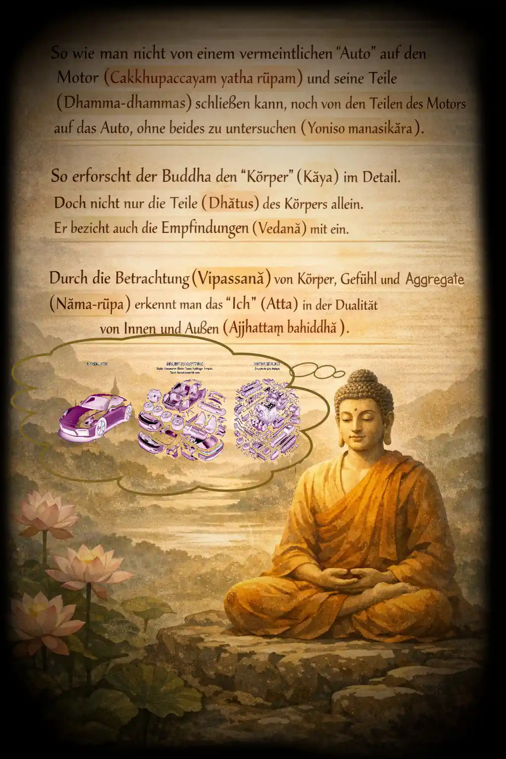 Der menschliche Körper selbst ist dabei nicht neutral, sondern das Ergebnis kammischer Formung. Er ist so strukturiert, dass er bestimmte attraktive saññā hervorbringt. Diese Attraktivität ist nicht im Objekt begründet, sondern Ausdruck vergangener Neigungen und Sehnsüchte, die über frühere Existenzen hinweg kultiviert wurden. In diesem Sinne ist Wahrnehmung nicht nur ein gegenwärtiger Akt, sondern die Fortsetzung einer langen Kette bedingter Formungen, in der sich Begehren und Erfahrung gegenseitig als Sinn eines Ding (sankhata) hervorbringen. [LP]”