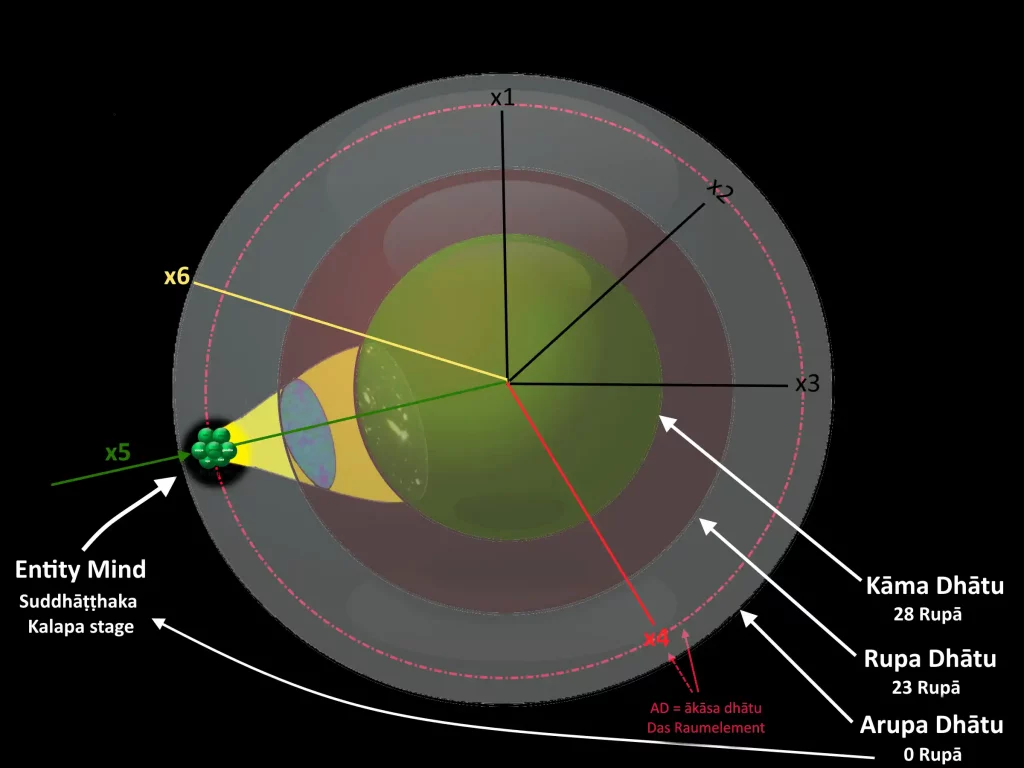 Auf dem Bild sind zwei verschränkte Elementarteilchen dargestellt, die von der Entität „Pancakkhandha“ aus dem „Nama Loka“ auf der Grundstufe Viññāna Dhatu gesteuert werden. Die gezackten Linien oberhalb der Elementarteilchen repräsentieren die Potenziale, wobei jedem Elementarteilchen eine minimale und maximale Wahrscheinlichkeit zugeordnet ist. Auf der Quantenebene wird bei der Verschränkung tatsächlich keine andere Information übertragen als die Verschränkung selbst; dieses Phänomen betrifft jedoch ausschließlich einzelne Quantenobjekte und ist nicht auf höhere kollektive Ebenen, wie etwa Kalapas, übertragbar.