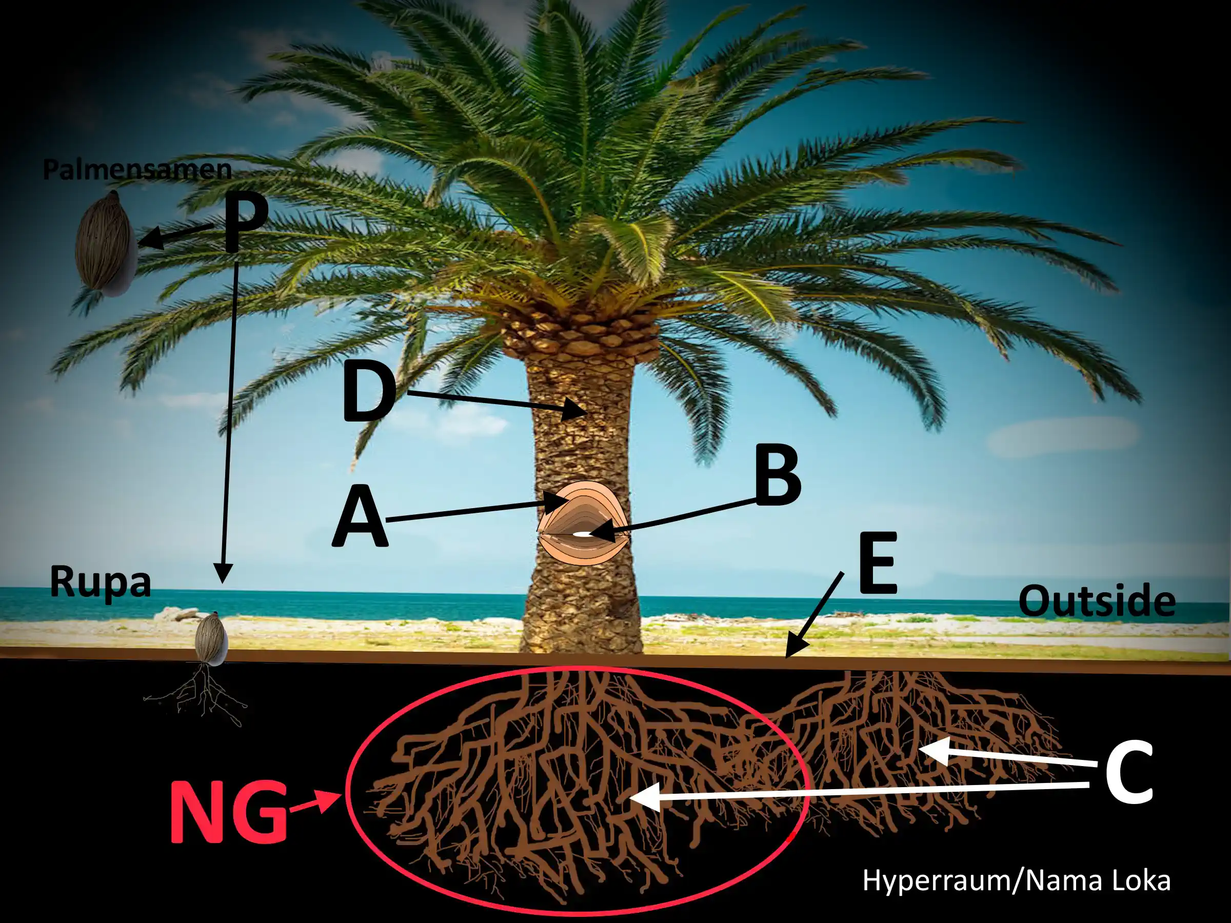 Die Wurzeln der Palme und ihre Struktur stehen für die Pañcupādānakkhandha, wobei jede einzelne Wurzel mit einem Nāmagotta (NG) oder Wurzelballen korrespondiert. Das Wachstum der Palme – von P (Samen) zur ausgewachsenen Pflanze – vollzieht sich durch die Ausweitung des Wurzelsystems (Pañcupādānakkhandha und NG) sowie gleichzeitig durch die Entwicklung der Komponenten A, C und D.