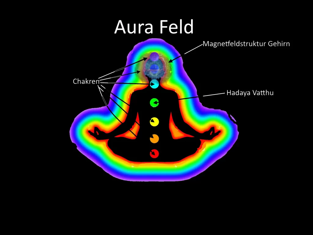 Das menschliche Gehirn produziert auf dieser Grundlage multiple, sich überlagernde Magnetfelder, wobei zwei hemisphärische Zentren und dynamisch wechselnde Areale mit maximaler Feldintensität identifiziert werden können. Diese Magnetfelder könnten nach meiner Auffassung mit den elektromagnetischen Strukturen des sogenannten Hadaya Vatthu (Herzbasis des Bewusstseins im buddhistischen Abhidhamma) korrelieren. Dieses Zentrum wird in traditionellen Lehren als Träger des Bewusstseins verstanden und befindet sich innerhalb der subtilsten Materieschicht (rūpa) auf der Ebene des kāma-loka, wo es mit dem feinstofflichen Körper – Gandhabba oder manomaya kāya – in Verbindung steht.