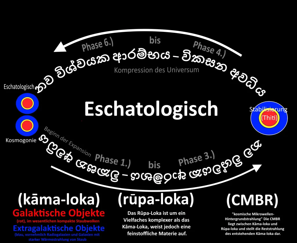 Diese drei dynamischen Zustände (Expansion, Kontraktion, und neutrale Leere) definieren zusammen mit der übergeordneten strukturellen Begrenzung durch „c“ die vier Phasen kosmischer Erscheinung. Von diesen wurde bislang nur die Phase der Expansion – also die erste – innerhalb der Kāma Dhātu-Ebene bewusst erkannt und konzeptualisiert.