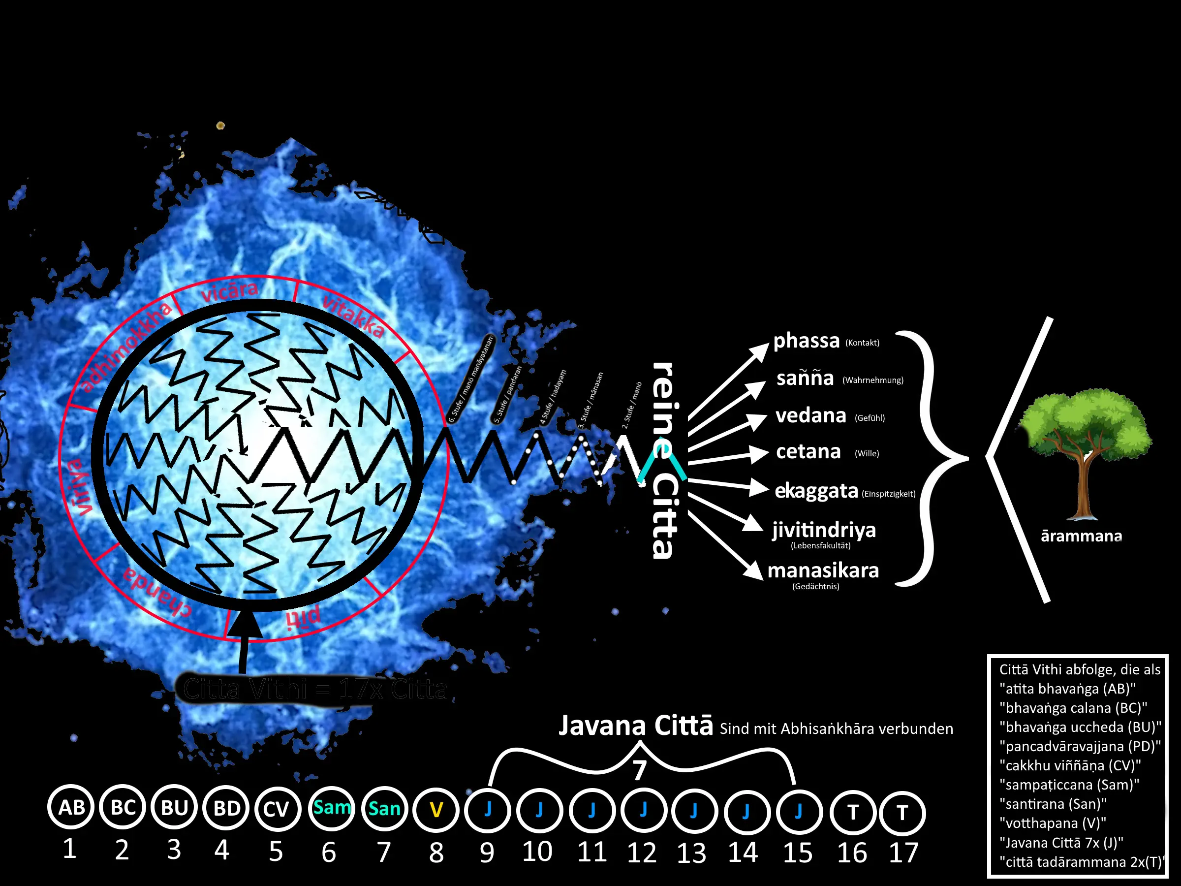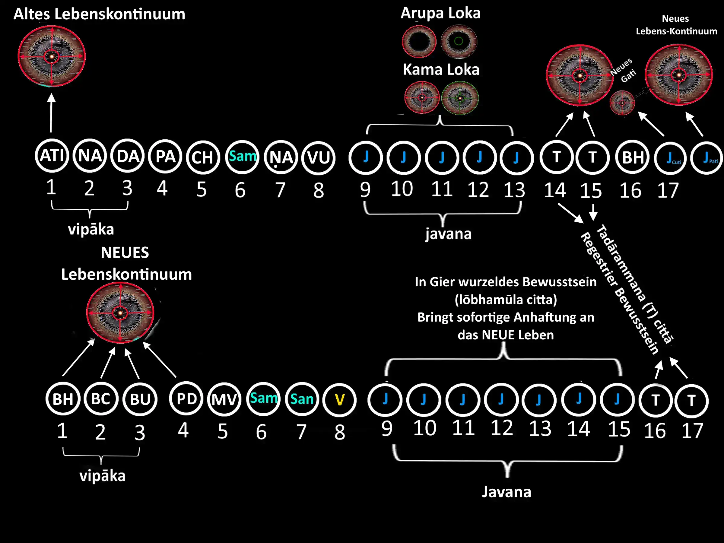 Das hunderttausendfache Rezitieren des Mantras lässt sich wohl der Praxis der Satipaṭṭhāna zuordnen – der Sammlung und Vergegenwärtigung. Doch schon der bloße Zweifel an der Weisung des Meisters offenbart die Trübnis von Vicikicchā, dem lähmenden Zweifel, der den Pfad zur Einsicht behindert.
